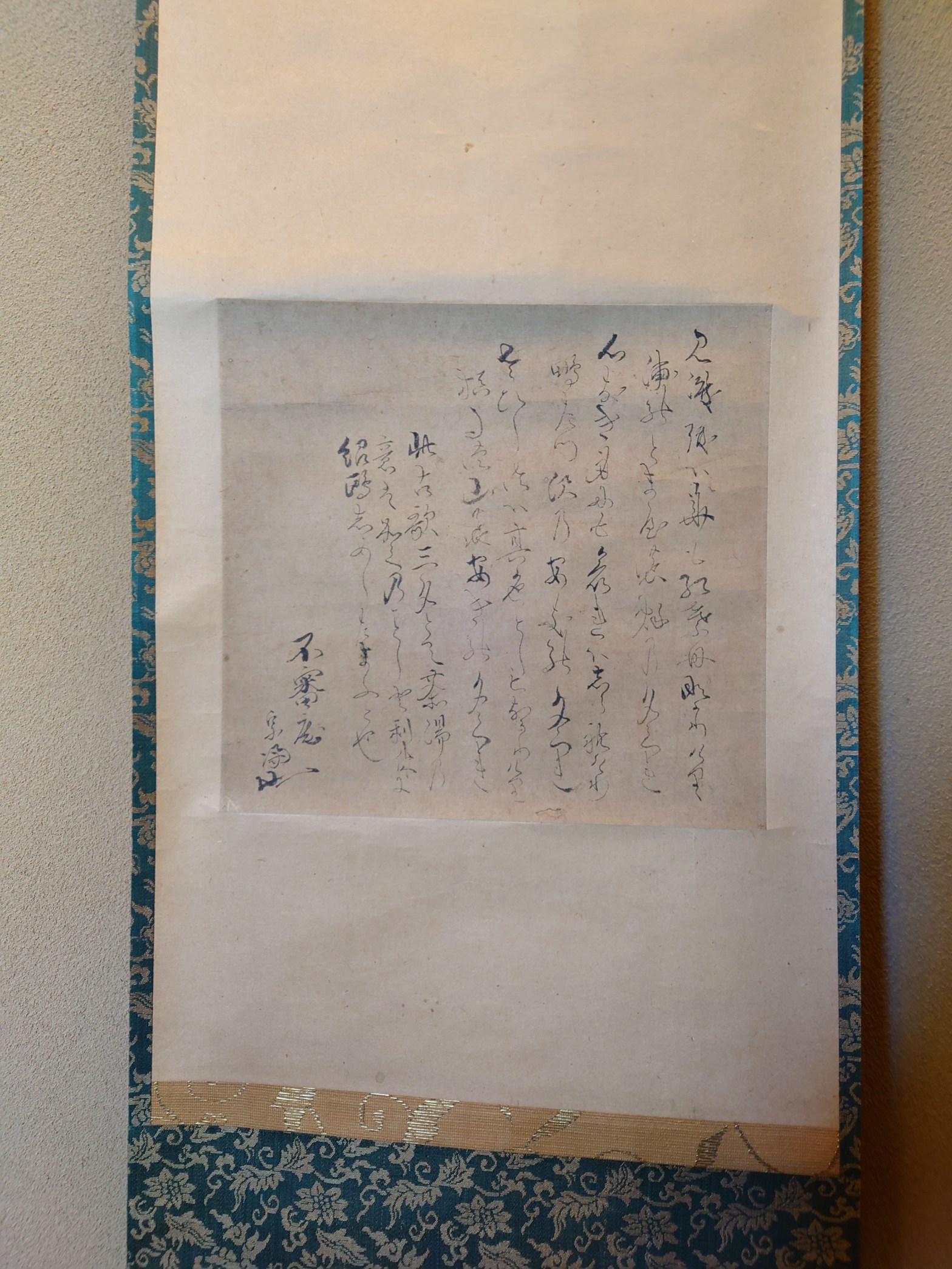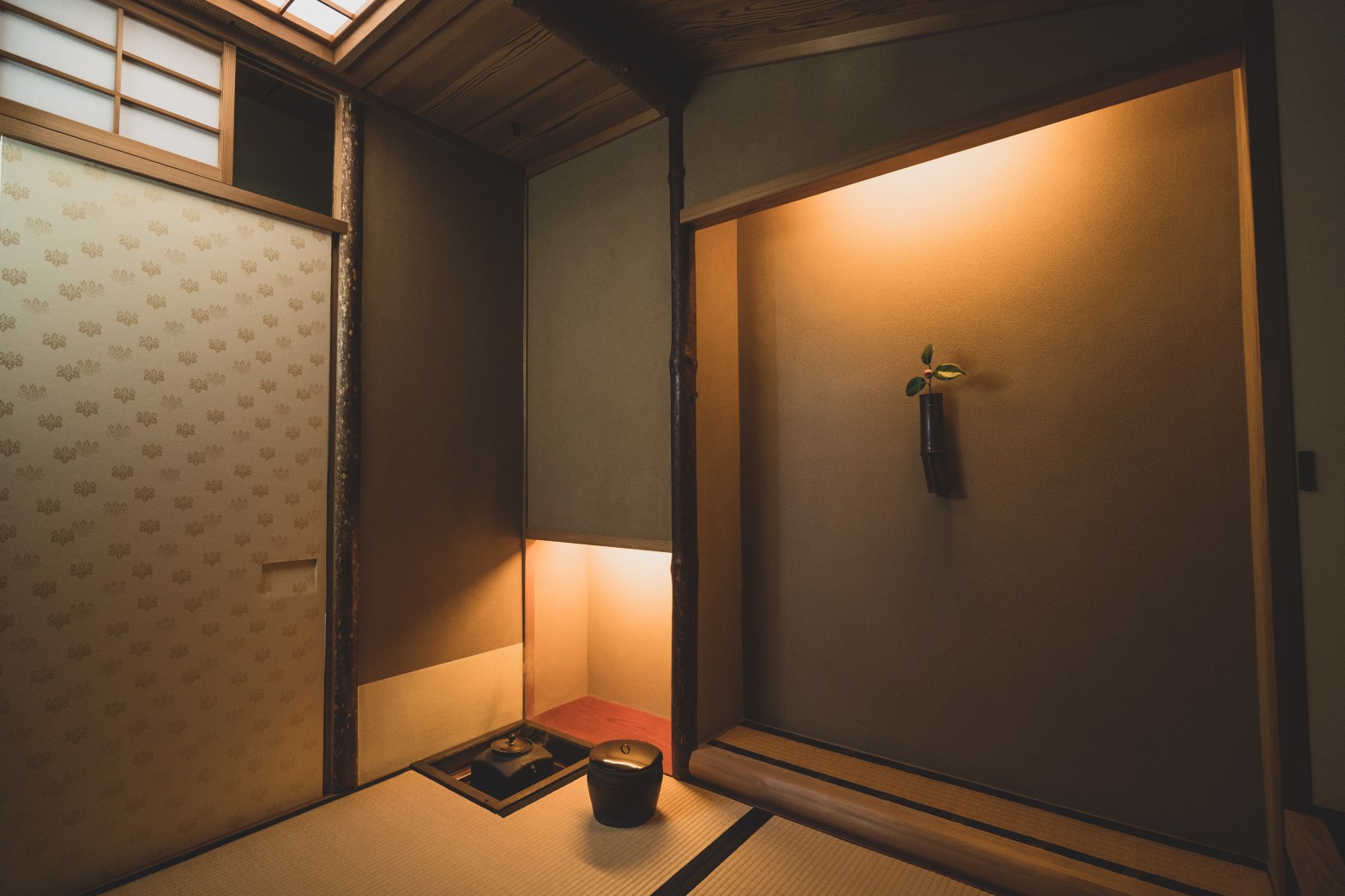 一、正客床前へ行き、両手をつき、懸物を見る。それにて、見えざる時は其の後、立ちて見てよし。其の文句高く読む事あるべからず。前に記す意なり。扨て、炉前へ行き、釜、又は、棚の置合を見るべし。堂庫ある座敷にて、むさと、戸を明く続きを読む “第五 座入りして作法の事 便蒙二 四左 その二”